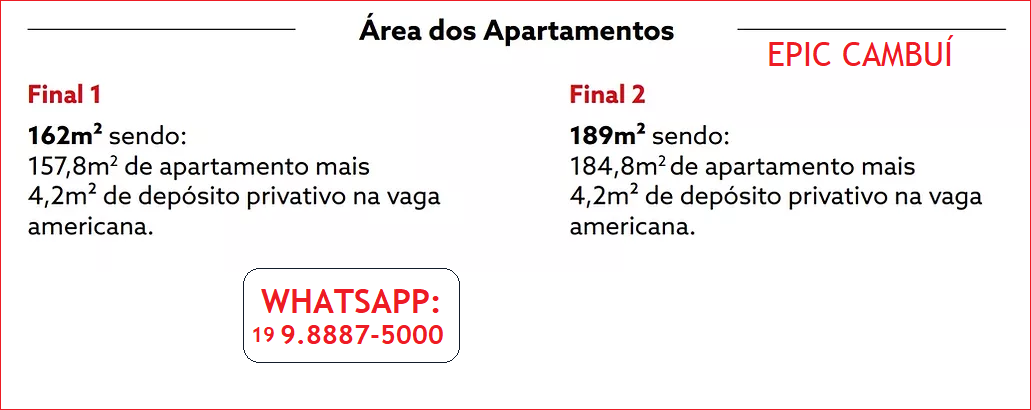 Com a qualidade e sofisticação dos empreendimentos da Construtora de apartamentos PATRIANI, o EPIC CAMBUÍ PATRIANI é um Prédio de Apartamentos de alto padrão, plantas de 162 m² a 189 m², várias opções de distribuição interna, 3 ou 4 suítes, 3 vagas demarcadas (2 elétricas e uma vaga Americana, com Hobby box de 4,2 m²), varanda social e varanda gourmet com churrasqueira a carvão.